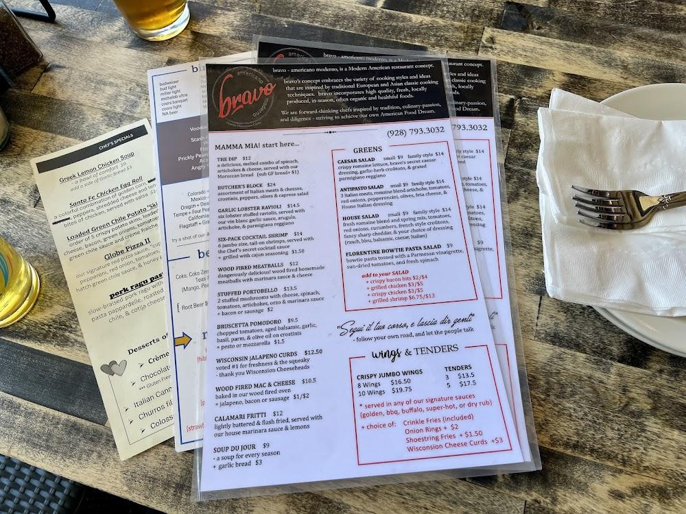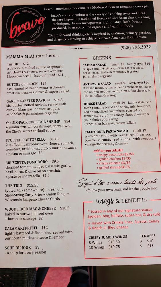 Welcome to Bravo Americano Moderno, a charming restaurant nestled in the heart of Downtown Globe’s Historic District. We offer a delightful selection of modern American cuisine, featuring mouthwatering wood-fired pizzas and seasonal Chef Specials crafted from the freshest ingredients. Enjoy our expertly mixed cocktails or a refreshing beer from our extensive on-tap selection as you unwind in our inviting atmosphere. Whether you’re dining solo, with friends, or family, Bravo is the perfect spot for lunch or dinner. Join us for a memorable culinary experience that blends creativity with tradition, all while enjoying our accessible amenities and friendly service.