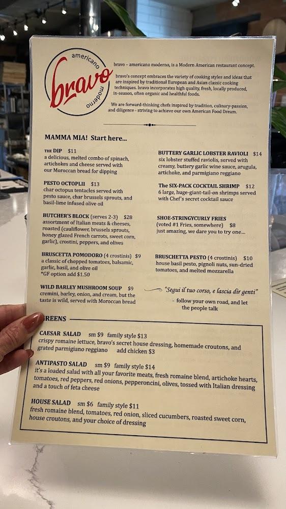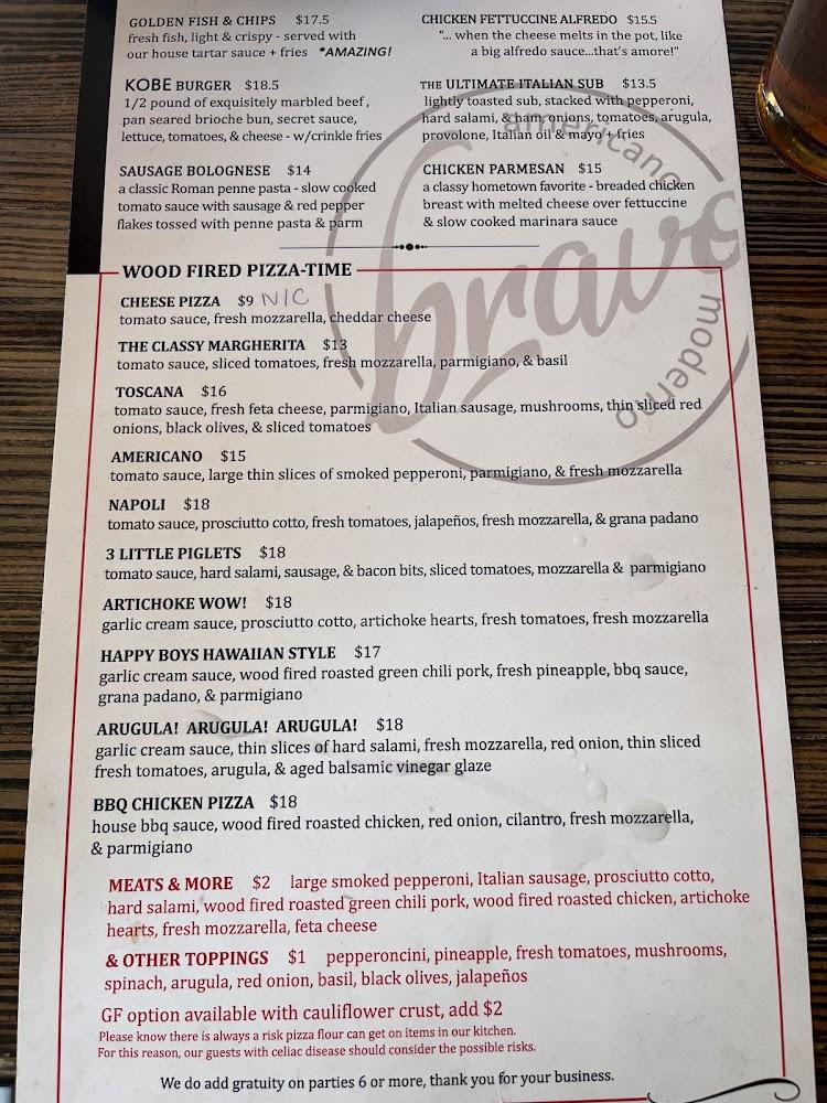 Bravo Americano Moderno's menu offers a delightful array of dishes. Standout options include classic wood-fired pizzas, innovative Chef Specials, and fresh salads. Prices remain reasonable, with an average around $13.32. The menu features 36 different plates, ensuring variety.